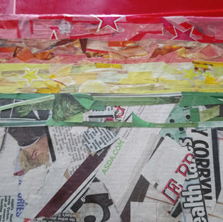 Having used PVA glue and water to paste a newspaper background onto the brown card, I was ready to start my rainbow collage. I decided to do rainbow stripes rather than a curved rainbow. Progress was slow due to the process I go through of finding pieces to fit gaps or cutting pieces to fit gaps rather than a more slap-dash approach of sticking any old bit of paper in any given spot. I worked at a rate of roughly one colour per day. I worked in the bedroom upstairs, on the bed which faces the window. I generally listened to Radio 2 throughout my time doing this piece but occasionally, depending on the time of day, listened to Magic Radio or watched the BBC News channel. My creative hours tend to be between 10am and 5pm but this changes sometimes if I'm really enjoying it or having a less productive day. I always stop to join the family for our daily exercise and for our evening meal although I often have lunch upstairs!